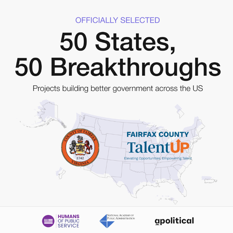 Fairfax County is proud to announce that its Talent Up Fairfax program has been selected as Virginia’s featured innovation in 50 States, 50 Breakthroughs. The recognition underscores Fairfax County’s success in building a resilient, inclusive economy through innovative workforce solutions for both businesses and jobseekers. Launched by Fairfax County’s Department of Economic Initiatives in late 2023, in partnership with The SkillSource Group and the Department of Family Services, Talent Up Fairfax addressed a dual challenge: connecting overlooked jobseekers with high-quality career pathways while providing businesses with a low-risk strategy to expand their workforce. Learn more about why Talent Up Fairfax was selected.
