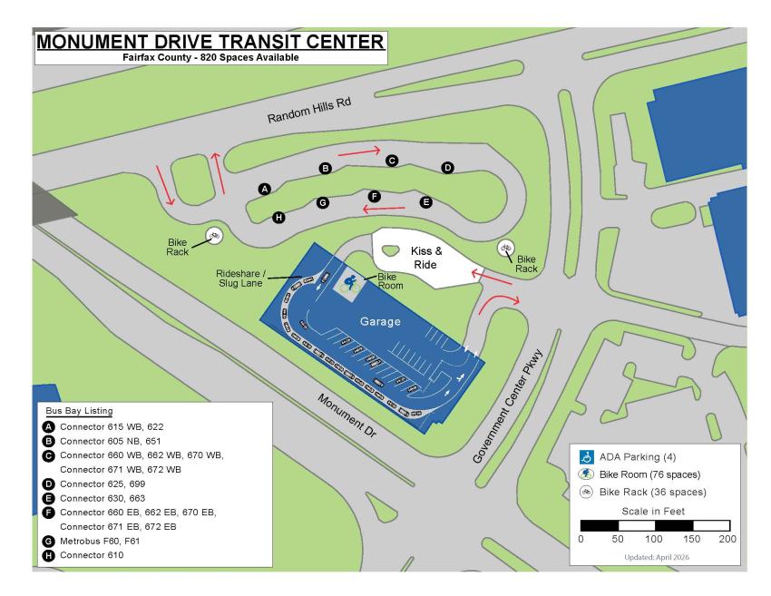 - Served by Fairfax Connector routes 605, 610, 615, 622, 625, 630, 651, 660, 662, 663, 670, 671, 672, 699 and Metrobus routes 2B and 1C