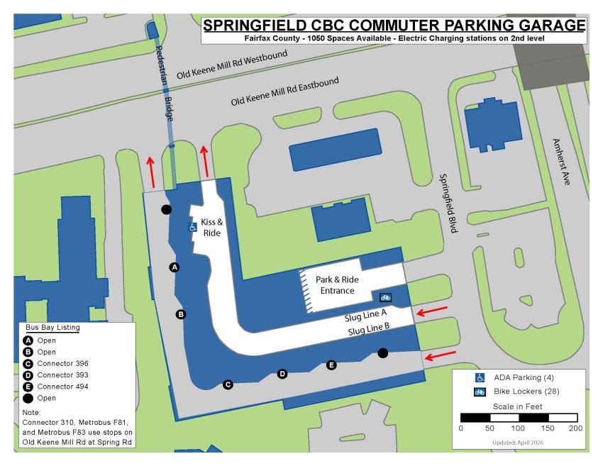 - Served by Fairfax Connector routes 231, 232, 301, 305, 310, 321, 322, 334, 335, 340, 341, 371, 372, 373, 401, 402 and 494