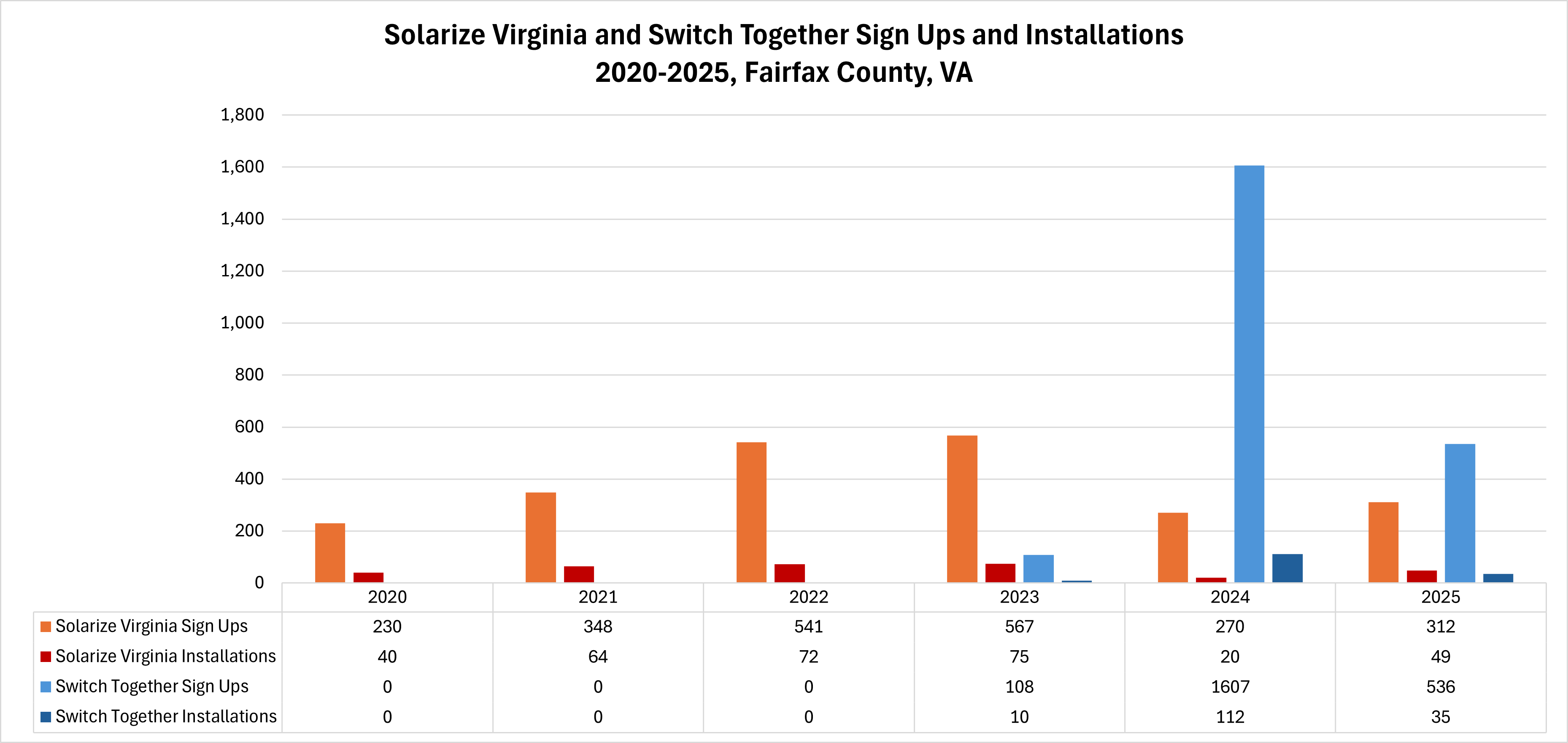 This program is run by the national nonprofit Solar United Neighbors (SUN) and is available to people living in and around the metro DC area. 2025 was the third year it was promoted by Fairfax County Government, and the program has had 2,251 registrations and 157 signed contracts for solar in Fairfax County. Fairfax County has a webpage dedicated to going solar, including information about Solarize Virginia and Switch Together