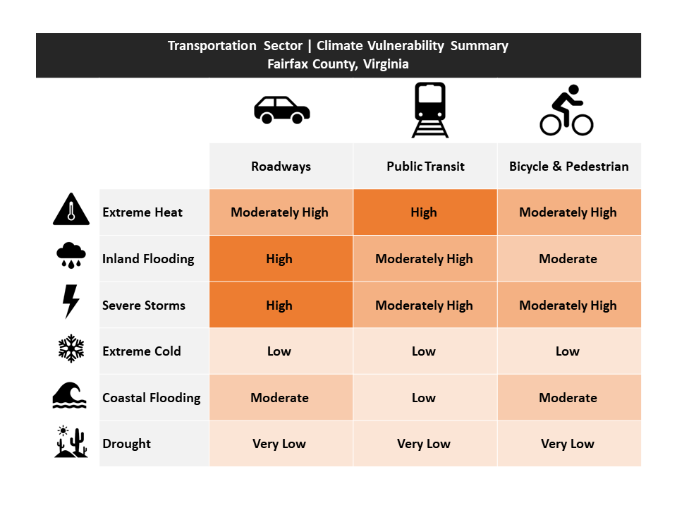 For more information on the bicycle and pedestrian network in general, please see the Fairfax County Department of Transportation webpage. Bicycle and pedestrian networks have a moderately high vulnerability to extreme heat and severe storms, and a moderate vulnerability to inland flooding and coastal flooding.
