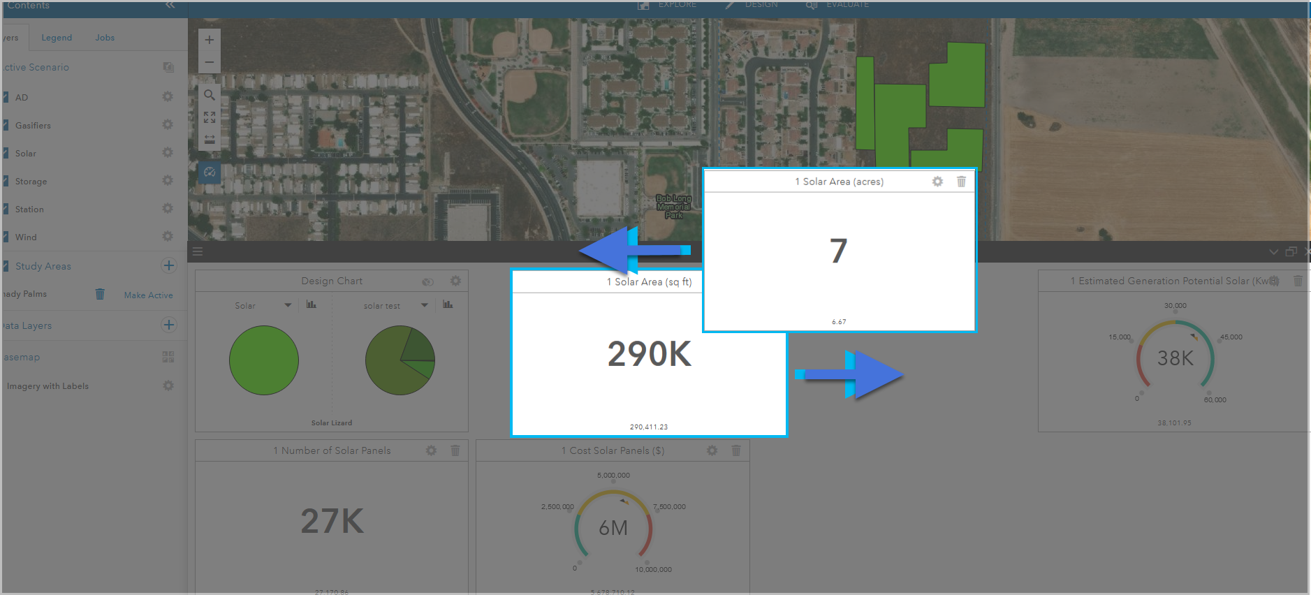 ArcGIS GeoPlanner dashboards display Scenario Indicator, Baseline Indicator, and Chart Indicator information in gauges, numeric values, and charts so you can quickly visualize and understand the effects of design decisions in real time. You can access the dashboard widget from many segments of the GeoPlanner workflow. The dashboard displays qualitative and quantitative information about your design layer or data layer point, line, and polygon features. As you add, update, and delete features in your design layers, the dashboard automatically updates indicators to provide you with immediate feedback on the effects of your design decisions. Baseline Indicators connected to data layers must be manually recalculated before their impact can be assessed with the dashboard.