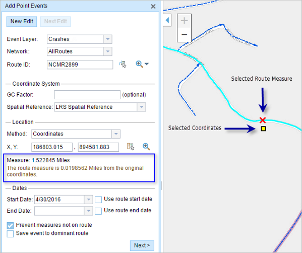 Point events such as crashes and traffic count sites can be represented as a single point event with measure information along the route. The Add Point Events widget allows you to create point events by typing or selecting their x- and y-coordinates.