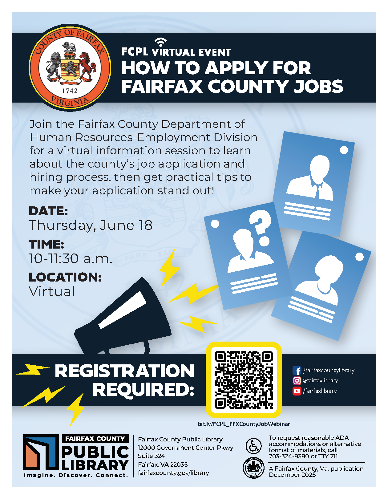 Interested in working for Fairfax County Government but not sure where to start? Join the Fairfax County Department of Human Resources-Employment Division at the “How to Apply for Fairfax County Jobs” virtual information session! Learn about the county’s job application and hiring process and get practical tips to make your application stand out!