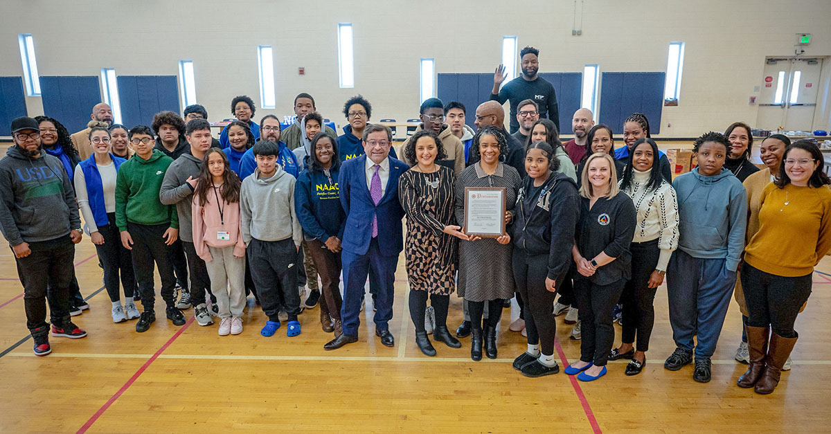 A group of high school students and several adults smiling and posing with a framed certificate.
