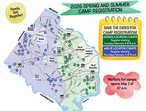 Camp registration will open based on the camp location in Fairfax County. Review the map and the location listing and then mark your calendars for #TeamGreen registration on Tuesday, February 3 or #TeamBlue registration on Thursday, February 5.