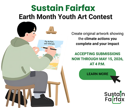 Fairfax County’s Office of Environmental and Energy Coordination (OEEC) invites students to showcase how they are taking action for our planet in the Sustain Fairfax Earth Month Youth Art Contest. Students are encouraged to submit original artwork supporting the theme “My Action, Our Climate”, highlighting climate actions they complete and the impacts of those actions, as noted on the Sustain Fairfax Challenge.
