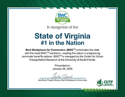 Fairfax County Department of Transportation partners with Best Workplaces for Commuters (BWC) to recognize employers who have excelled in implementing green commuter programs, including ridesharing, transit benefits, biking and walking, teleworking, alternate work schedules and other strategies.